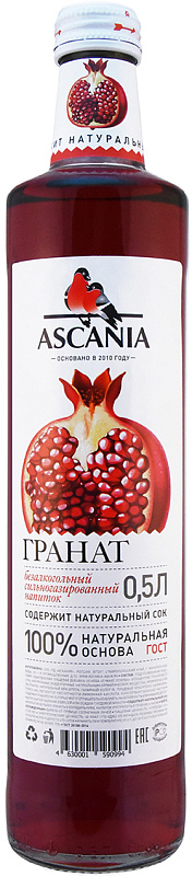 Подготовленная вода, сахар, концентрат гранатового сока, концентрат яблочного сока, регулятор кислотности лимонная кислота, ароматизатор пищевой гранат, консервант бензоат натрия, красители: сахарный колер IV, кармуазин, понсо 4 R