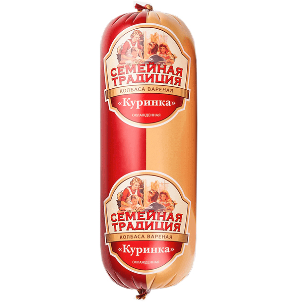 Мясо птицы механической обвалки, вода, филе птицы, шкурка свиная, крахмал картофельный, крупа манная, молочный белок, крахмал кукурузный, посолочная смесь (соль поваренная пищевая, фиксатор окраски нитрит натрия), комплексная пищевая добавка регуляторы кислотности - пирофосфаты, трифосфаты, антиокислитель - изоаскорбат натрия, сахар, экстракты и эфирные масла: перец черный, перец белый, орех мускатный, мацис ,чеснок), животный белок, загуститель - каррагинан, чеснок, пищевой краситель - кармины