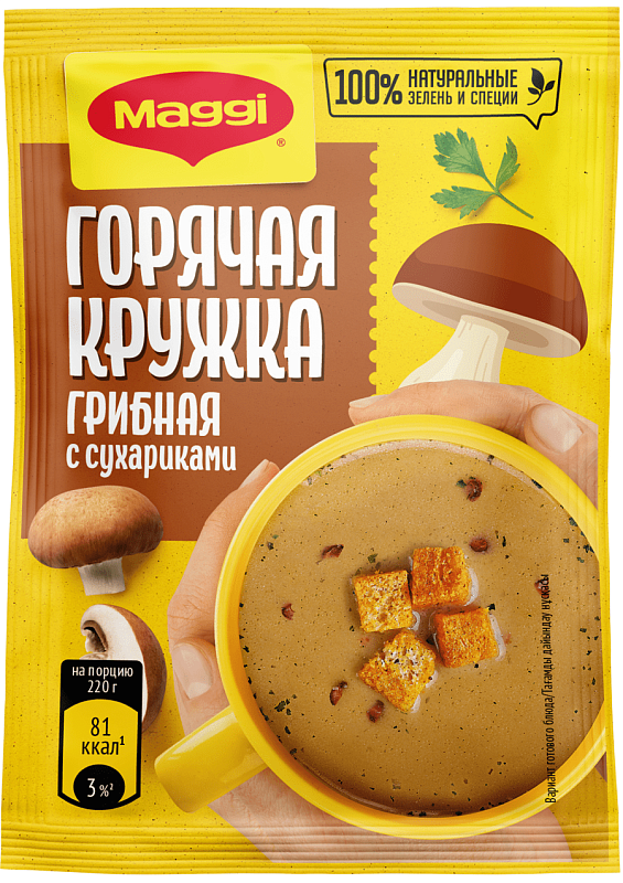Сухарики пшеничные (30%) (мука пшеничная (содержит глютен), масло растительное, соль, дрожжи), крахмал кукурузный, мука пшеничная (содержит глютен), йодированная соль (соль, йодат калия), сахар, пальмовое масло, сушеные овощи (морковь (2,1%), чеснок (порошок), лук репчатый (порошок)), сухой сироп глюкозы, мальтодекстрин, концентрат шампиньонов (2%), подсолнечное масло, лактоза, ароматизатор (содержит молоко), казеинат натрия (получен из молока), натуральный ароматизатор, сушеная зелень (петрушка, укроп), куркума, стабилизатор (цитраты натрия)