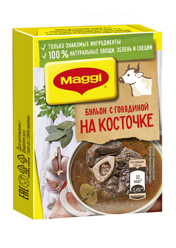 Йодированная соль (соль, йодат калия), сахар, крахмал кукурузный, мясные ингредиенты (говяжий жир топленый, говяжий порошок сушеный), сухой сироп глюкозы, кукурузный соус (крахмал кукурузный, соль), ароматизатор (говядина на кости), вода, карамелизированный жженый сахар в порошке, овощи и зелень сушеные (0,7 %) (петрушка, чеснок, лук), регулятор кислотности (лимонная кислота), специи молотые (куркума, лавровый лист, кориандр, мускатный орех, перец черный)