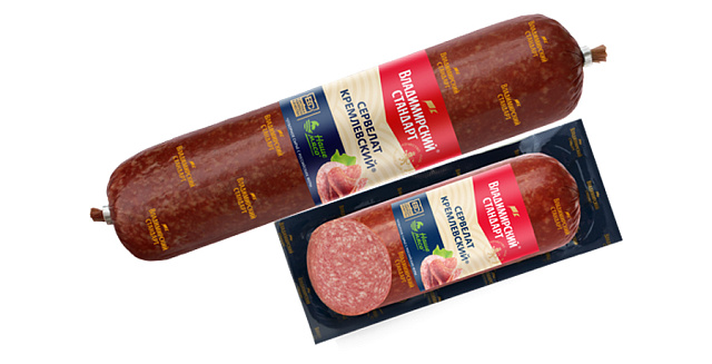Свинина, шпик, мясо куриное кусковое, говядина, мясо куриное механической обвалки, посолочно-нитритная смесь (соль, фиксатор окраски нитрит натрия), комплексная пищевая добавка (усилитель вкуса и аромата глутамат натрия, пряности и экстракты пряностей, стабилизатор пирофосфат натрия, регулятор кислотности трифосфат натрия, соль, антиокислитель изоаскорбат натрия, ароматизатор), комплексная пищевая добавка (регулятор кислотности глюконо-дельта-лактон, сахароза, соль, усилитель вкуса и аромата глутамат натрия, антиокислитель аскорбиновая кислота), комплексная пищевая добавка (регуляторы кислотности: лактат кальция, ацетат натрия, цитрат натрия 3-замещенный), комплексная пищевая добавка (гемоглобин, сироп глюкозы, краситель кармины, антиокислитель изоаскорбат натрия), чеснок
