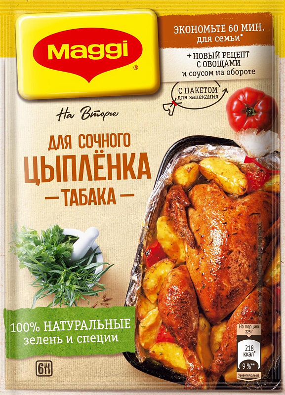 Maggi на второе для сочного цыпленка табака поможет легко и быстро приготовить вкусное блюдо грузинской кухни! Запеченная целиком в специальном пакете без дополнительного добавления масла курочка получается необычайно сочной, вкусной и с хрустящей корочкой, а комбинация овощей и ароматных трав и специй восточной кухни поможет раскрыть вкус и аромат вашего блюда.