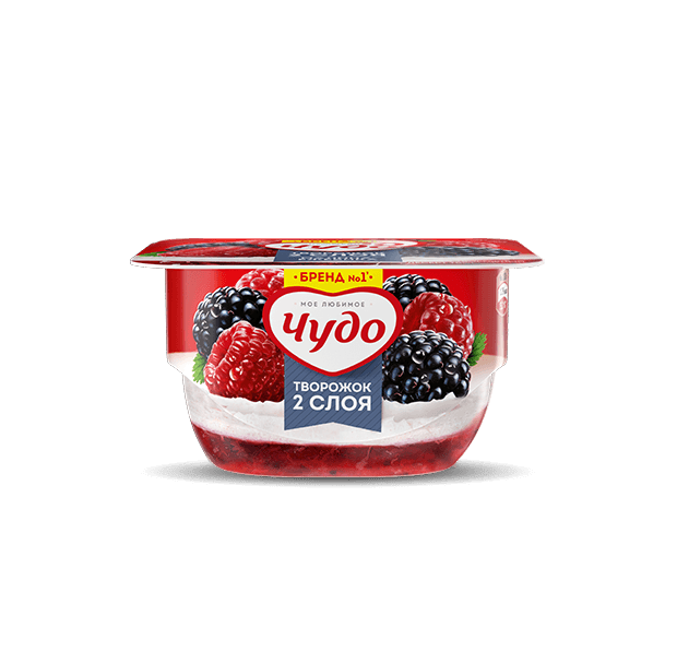 Взбитая творожная основа (творог, сливки, йогурт, сахар, стабилизаторы (Е1422, гуаровая камедь, камедь тары, пектин, Е1442), желатин), фруктовый наполнитель (вода, малина, сахар, глюкозно-фруктозный сироп (G), стабилизаторы (Е1442, гуаровая камедь, ксантановая камедь, камедь рожкового дерева), пюре из ежевики, краситель - кармины, ароматизатор «малина», регуляторы кислотности (лимонная кислота, цитрат натрия 3-замещенный))