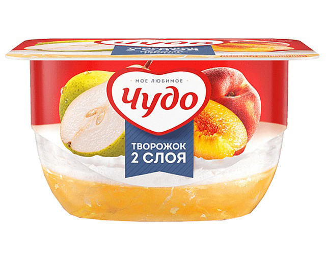 Взбитая творожная основа (творог, сливки, йогурт, сахар, стабилизаторы (дикрахмаладипат ацетилированный, гуаровая камедь, камедь тары, пектин, дикрахмалфосфат оксипропилированный), желатин), фруктовый наполнитель (вода, фрукты (персик, груша), сахар, глюкозно-фруктозный сироп (G*), стабилизаторы (дикрахмалфосфат оксипропилированный, гуаровая камедь, ксантовая камедь рожкового дерева), ароматизатор , регулятор кислотности-лимонная кислота)